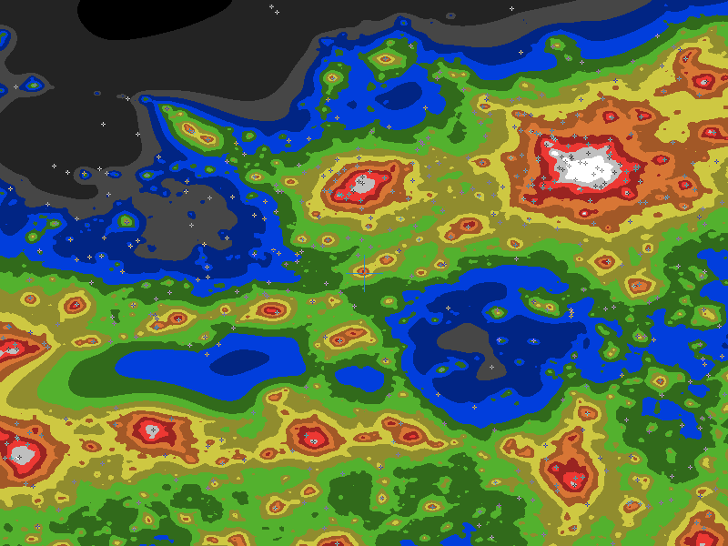The central cross marks the location of the Brockville clear sky chart. Tiny crosses mark other charts. This map assumes an observer at sea level. A real observer should see a slightly darker sky.