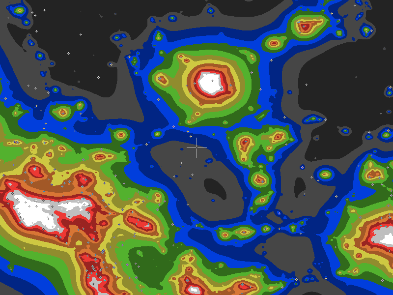 The central cross marks the location of the Hole-in-the-Wall Campground clear sky chart. Tiny crosses mark other charts. This map assumes an observer at sea level. A real observer should see a slightly darker sky.