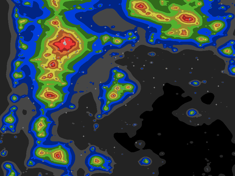 The central cross marks the location of the Redmond clear sky chart. Tiny crosses mark other charts. This map assumes an observer at sea level. A real observer should see a slightly darker sky.
