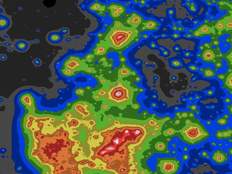 The central cross marks the location of the Skyview Observatory clear sky chart. Tiny crosses mark other charts. This map assumes an observer at sea level. A real observer should see a slightly darker sky.