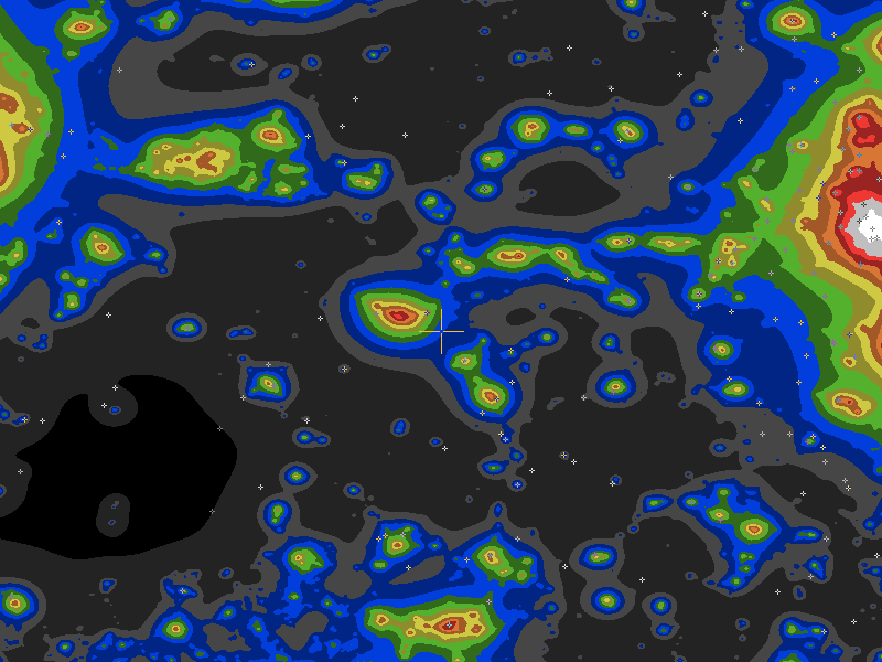The central cross marks the location of the Grand Mesa Observatory clear sky chart. Tiny crosses mark other charts. This map assumes an observer at sea level. A real observer should see a slightly darker sky. So it underestimates the sky darkness at Grand Mesa Observatory because of its 6138ft elevation.