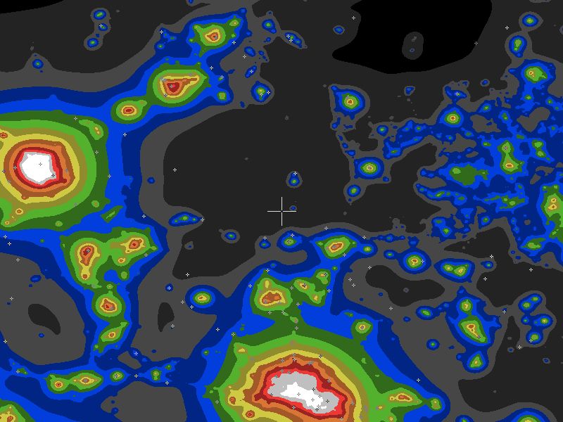 The central cross marks the location of the Annbar Canyon clear sky chart. Tiny crosses mark other charts. This map assumes an observer at sea level. A real observer should see a slightly darker sky. So it underestimates the sky darkness at Annbar Canyon because of its 5830ft elevation.