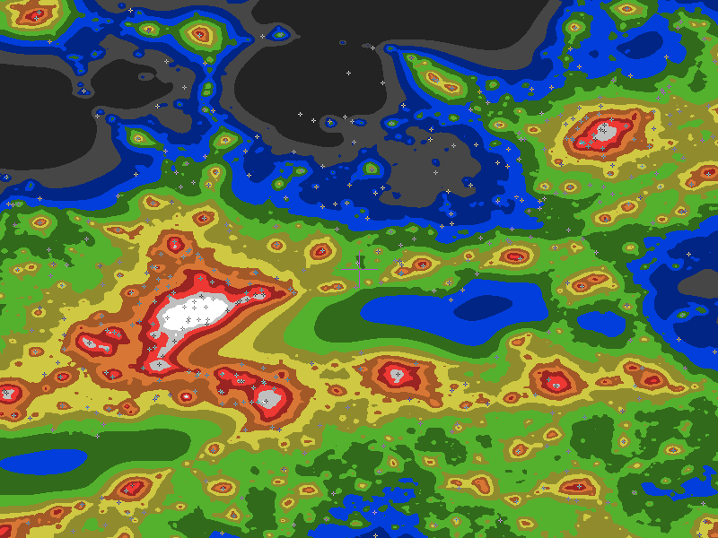 The central cross marks the location of the Lorenz Observatory clear sky chart. Tiny crosses mark other charts. This map assumes an observer at sea level. A real observer should see a slightly darker sky.