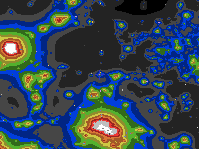 The central cross marks the location of the Malpas Observatory West clear sky chart. Tiny crosses mark other charts. This map assumes an observer at sea level. A real observer should see a slightly darker sky. So it underestimates the sky darkness at Malpas Observatory West because of its 6742ft elevation.