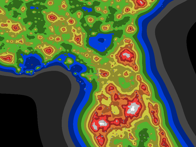 The central cross marks the location of the Newberry Star Park clear sky chart. Tiny crosses mark other charts. This map assumes an observer at sea level. A real observer should see a slightly darker sky.