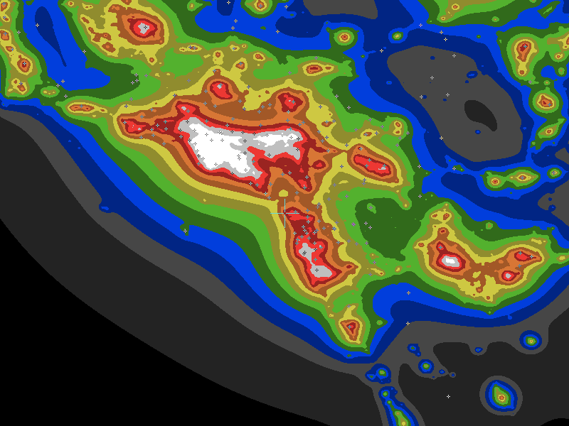The central cross marks the location of the Oceanside clear sky chart. Tiny crosses mark other charts. This map assumes an observer at sea level. A real observer should see a slightly darker sky.
