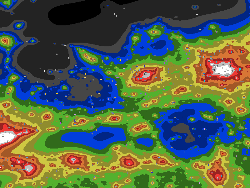 The central cross marks the location of the Perth clear sky chart. Tiny crosses mark other charts. This map assumes an observer at sea level. A real observer should see a slightly darker sky.