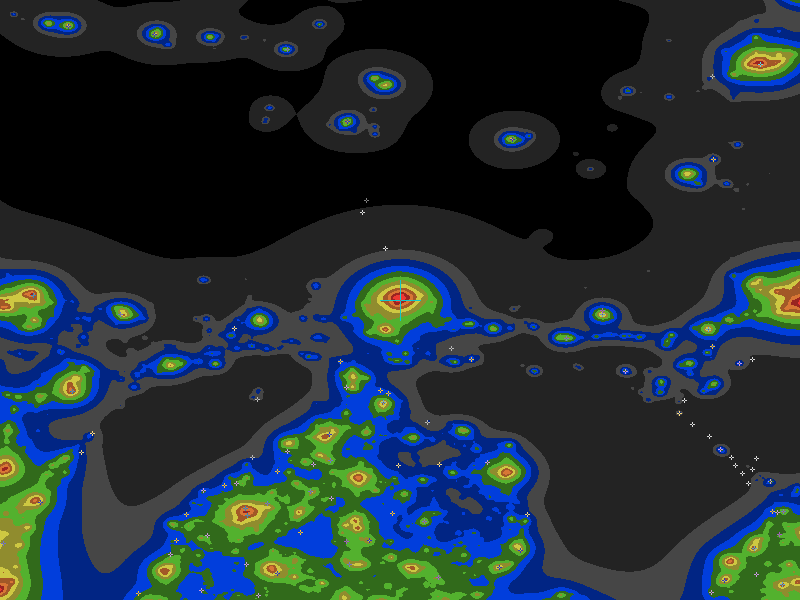 The central cross marks the location of the Sault Ste Marie clear sky chart. Tiny crosses mark other charts. This map assumes an observer at sea level. A real observer should see a slightly darker sky.