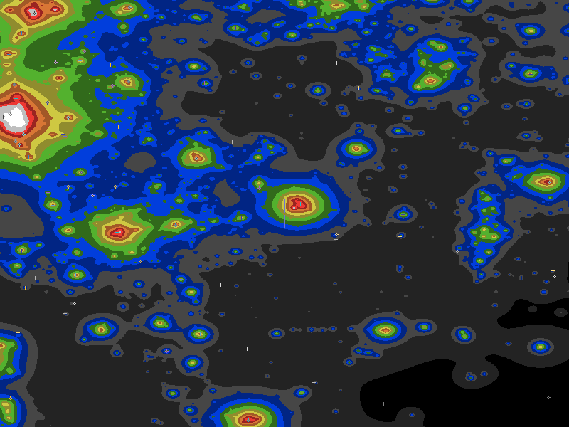 The central cross marks the location of the Sunridge Observatory clear sky chart. Tiny crosses mark other charts. This map assumes an observer at sea level. A real observer should see a slightly darker sky.
